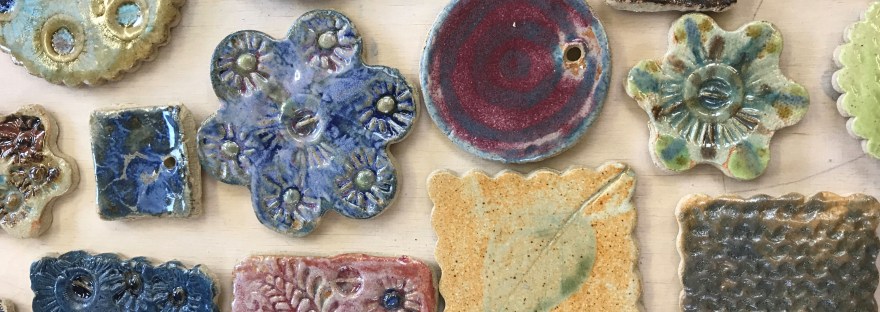 Rachel’s new pottery group meet on a Monday morning. After just 4 sessions they have learnt to coil and make pinch pots, they’ve mastered slab building and have made a lovely selection of test tiles. Rachel has encouraged the group to experiment with texture and overlaying glazes to achieve interesting results. Lovely!
